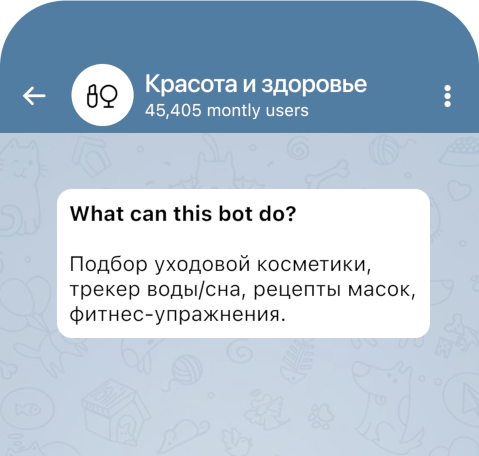 Красота и здоровье — это Telegram-бот, который помогает с подбором косметики, фитнес-рекомендациями и советами по питанию для улучшения внешнего вида и самочувствия.